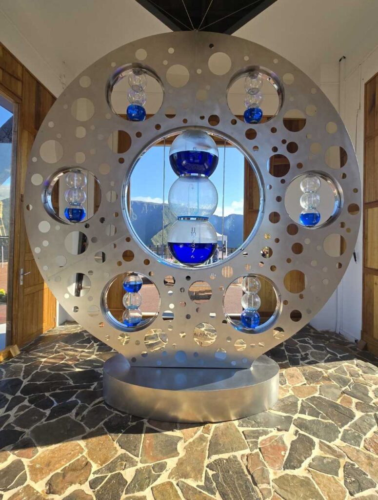 Les transparences de ce disque amènent le regard sur les montagnes dont les sources produisent l’eau salvatrice aux visiteurs aperçus dans les miroirs.